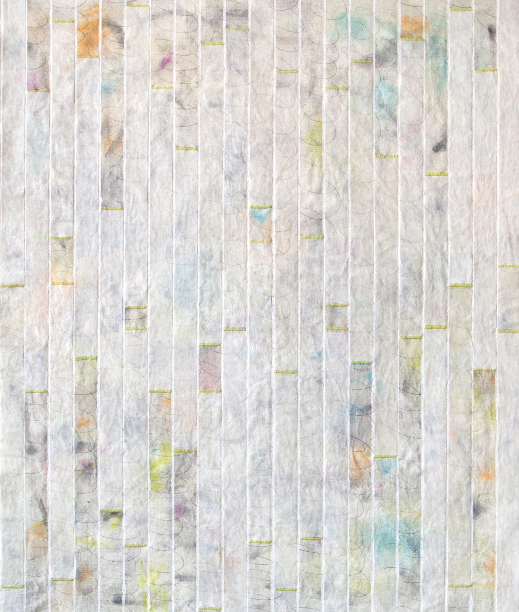 pastel, pen, acrylic, paper, thread on linen