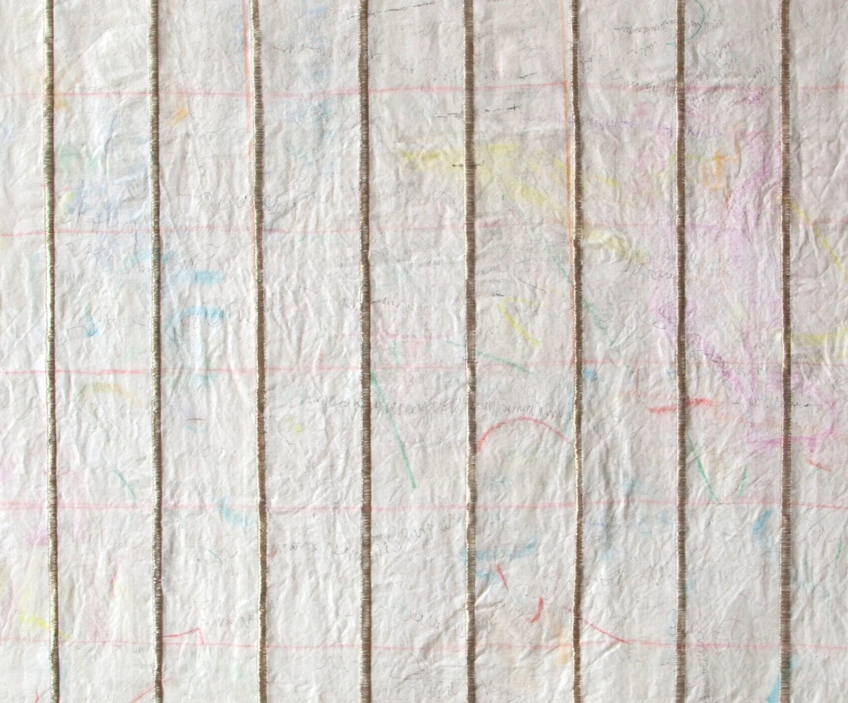 pastel, metallic thread, pen, pencil and paper on linen